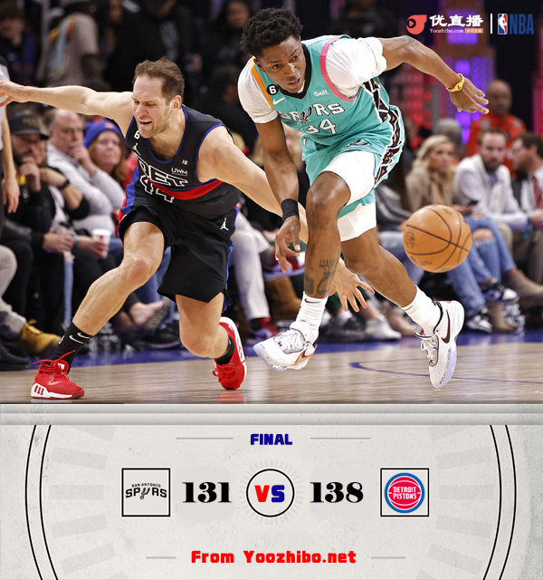 活塞今日坐镇主场迎战马刺,两支球队本赛季状态都很糟糕,活塞目前3连败排在东部倒数第一,而马刺则吃到10连败排在西部倒数第二。首节对决马刺客场作战但状态更优,节中一波12-5的攻势帮助他们占据上风并在末段一度拉开至两位数领先;次节马刺连续打三分得手分差一度拉大至半场最大的16分,不过活塞在这之后迎来反弹,他们突然找回手感回敬一波25-9的攻势一举抹平比分,马刺靠着科林斯最后的进球才重新取得1分领先进入下半场。休息归来活塞和马刺短暂拉锯中再度占据上风,他们不断冲击篮下送出12-2的攻势一举拉开比分;随后的马刺虽然被动但迎来奇兵,格拉汉姆最后时刻连续飙进三分帮助球队扳平比分比赛也被拖入加时。双方激战了两个加时才分出胜负,活塞最后时刻抓住机会送出7-0的攻势为球队收下比赛。最终,活塞双加时力克马刺并送后者11连败。