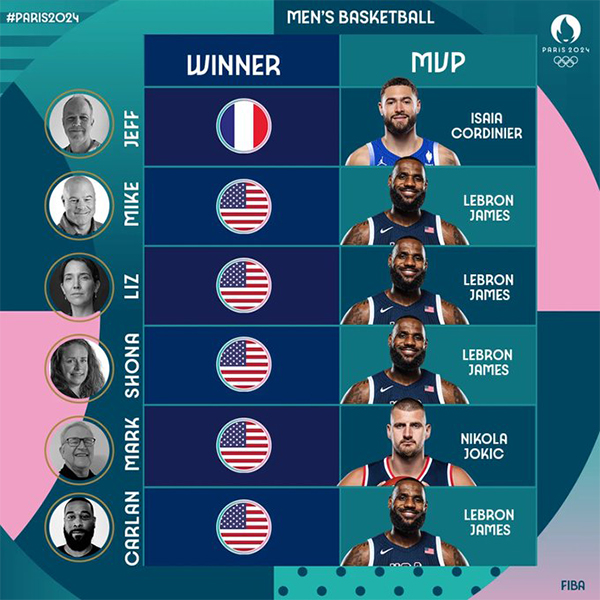 FIBA邀请了6位专家预测谁将夺得金牌?5人认为美国男篮夺冠,仅仅只有Jeff Taylor认为法国队将以微弱优势夺得冠军。
