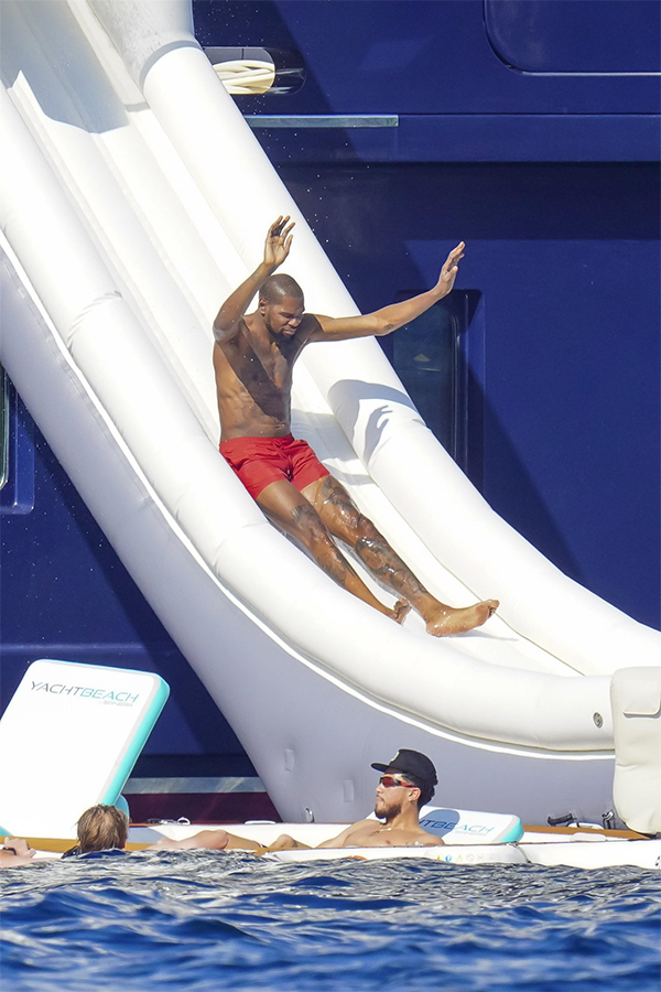 美国男篮夺冠之后,杜兰特和布克在圣特罗佩享受生活,他们在游艇上玩嗨了,杜兰特戴着墨镜晒日光浴以及玩滑梯,布克还与性感美女闲聊。