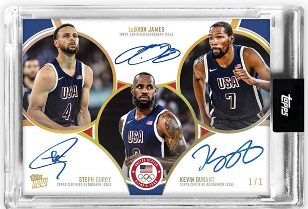詹姆斯、库里和杜兰特将在一张Topps卡片上签名,卡片上是这三名金牌得主身穿红白蓝三色美国队队服的照片,这张卡片将随机送给购买该类卡片的顾客。
