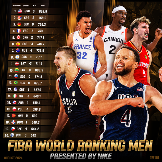 男篮世界排名更新:美国稳居榜首,中国男篮位置变