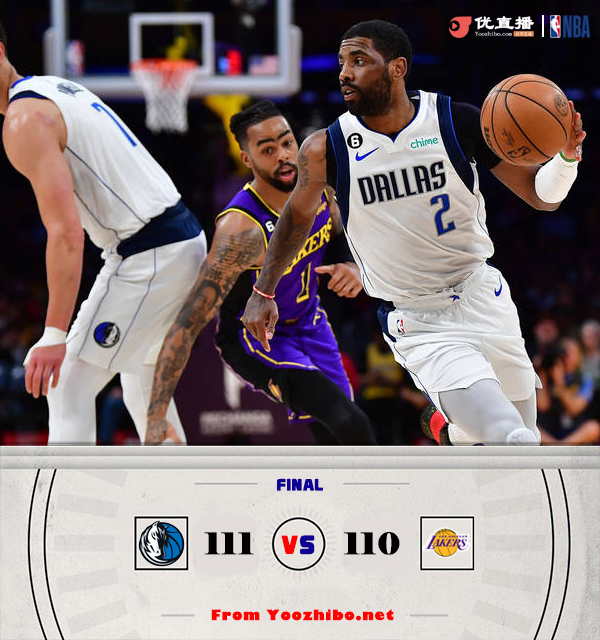 NBA常规赛继续进行,湖人主场迎战独行侠,湖人目前34胜36负排在西部第9位,而独行侠则是35胜35负排在西部第7位,本场比赛对双方的排位都有重大影响,欧文本场比赛火线复出,东契奇继续伤缺。比赛开始,湖人打得非常主动,布朗的三分和浓眉的内线很快建立起主动权,但独行侠依靠稳定的外线手感迅速追上比分,双方展开拉锯战,次节独行侠开始包夹浓眉,湖人外线不开使得进攻端非常不流畅,欧文里突外投带领三分手感火热的独行侠直接反超8分。下半场,欧文继续保持火热手感,里突外投帮助独行侠守住优势,末节施罗德和浓眉一内一外帮助湖人追分,里夫斯接连突内线又帮助湖人反超比分,随后独行侠连续浪费机会,湖人将分差拉开至两球以上,克莱伯三罚全中后追到差1分,浓眉关键两罚中一,克莱伯压哨三分绝杀,最终独行侠111-110险胜湖人。