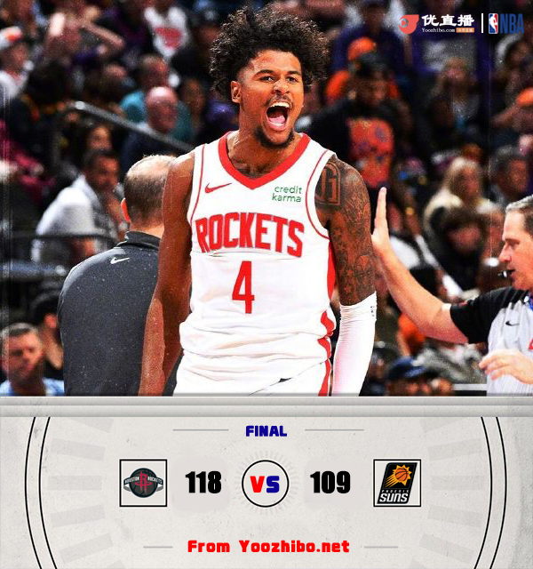 NBA常规赛太阳主场迎战火箭,太阳目前排在西部第五,最近取得2连胜,火箭则仅排在西部第十二,最近遭遇3连败,本场比赛比尔复出先发登场。比赛开始后没多久杰伦-格林和范弗里特就展现出火热手感,在他们带领下火箭首节就建立起19分优势,太阳外线手感冰凉,第二节火箭的轮换阵容打得不好一度被太阳追到只差6分,杰伦-格林回来后帮助火箭稳住阵脚。下半场两队大打对攻战,场上分差一直在10分左右徘徊,比尔和杰伦-格林发生冲突吃到2次技术犯规被驱逐,最后一节太阳多次迫近比分但关键时刻火箭总能及时回应,太阳未能完成翻盘,临近比赛结束前布克也崴脚返回更衣室,最终火箭118-109力克太阳结束3连败。