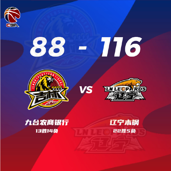 CBA常规赛,本轮辽宁对阵吉林。辽宁7连胜高居联赛第三,吉林排在第十二。琼斯本场缺阵。比赛开始,双方开场阶段势均力敌,比分交替领先,相持中辽宁逐渐占据上风,郭艾伦得分助攻一肩挑带队打出18-4的攻击波取得两位数优势,半场战罢辽宁65-50领先。易边再战,吉林率先发力缩小分差,但辽宁及时回暖,多点开花一举将分差拉开到20分以上,吉林毫无起色,辽宁越战越勇将优势扩大到30分以上。最终,辽宁116-88大胜吉林,迎来8连胜。