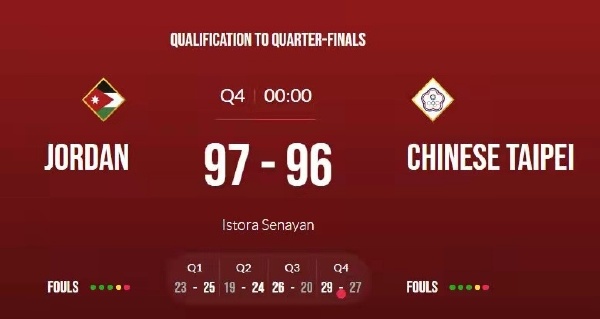 ,2022年男篮亚洲杯复赛,约旦队97-96绝杀中国台北队。中国台北队上半场打的顺风顺水,半场49-42领先,刘铮第一节就砍下13分2篮板2助攻5抢断。约旦队下半场奋起直追,最后55秒中国台北队依然领先9分,约旦队没有放弃伊布拉西姆3罚3中,哈瓦斯三分飚进,最后2秒,伊布拉西姆运球过中圈后超远压哨三分绝杀中国台北。约旦队将在1/4决赛对阵伊朗。
