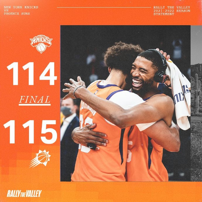 NBA常规赛继续进行,高居联盟第一的太阳主场迎战尼克斯,缺少布克和保罗的太阳上场大胜开拓者终结连败,而尼克斯近来遭遇六连败位列东部倒数第四,此役一上来两队手感火热陷入僵持,兰德尔予取予求首节独得14分,布里奇斯连中三分率队逐渐占优,首节结束时太阳领先2分,次节回来,两队太阳延续外线火热手感,沙梅特和约翰逊连中三分,尼克斯多点开花继续紧咬比分,半场战罢,太阳继续领先3分。易边再战后富尼耶联手兰德尔打出7-0小高潮,尼克斯一举反超,随后双方你来我往继续僵持,兰德尔与约翰逊爆发冲突,前者累积两T被驱逐,但尼克斯多点开花扩大优势,三节结束后尼克斯反超12分,末节上来,约翰逊连进三分率队打出9-0小高潮缩小分差,约翰逊手感滚烫单节轰下21分,尼克斯内外结合总能及时回应,关键时刻克劳德飚中反超三分,罗宾逊补篮打进再度反超,约翰逊最后时刻上演压哨三分绝杀,最终太阳115-114险胜尼克斯。