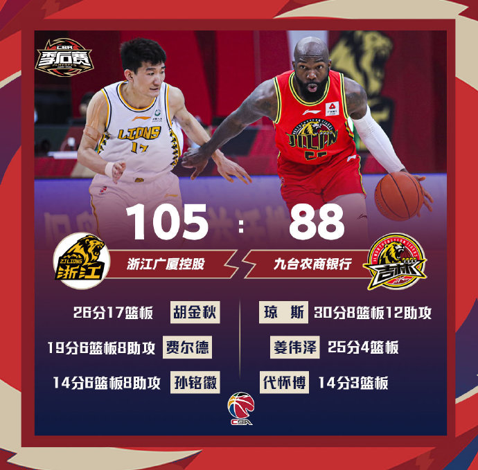 广厦:胡金秋26分17篮板3抢断,赵岩昊21分,费尔德19分6篮板8助攻2抢断,孙铭徽14分6篮板8助攻3抢断,许钟豪12分9篮板1助攻5封盖,李京龙9分2助攻