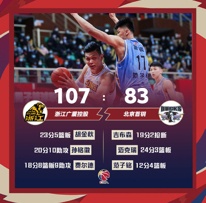 广厦(30-21):胡金秋23分5篮板,孙铭徽20分10助攻,赵岩昊16分4助攻4篮板6抢断,费尔德18分8篮板9助攻,冯欣12分3篮板,许钟豪7分5篮板,朱俊龙3分3篮板,吴骁2分3篮板,李金效6分8篮板
