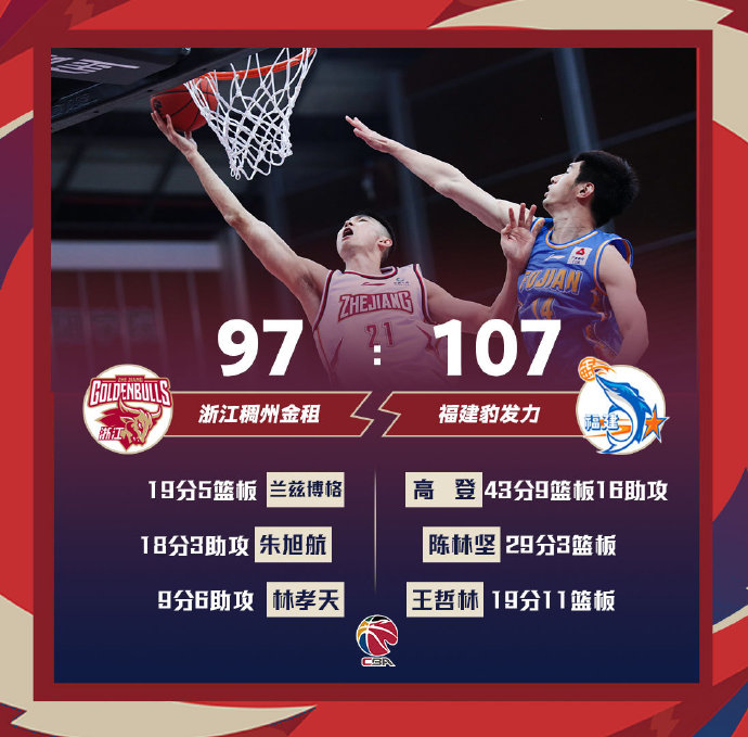 CBA常规赛进入收官阶段,已经无缘季后赛的福建挑战浙江,吴前和陆文博此役复出,首节一上来两队你来我往陷入僵持,朱旭航状态火热对飚高登,首节结束时浙江暂时领先3分,次节回来,双方外线手感滚烫火热对飚,高登联手陈林坚率队反超,半场战罢,福建48-47占据上风。易边再战后福建内外结合继续占优,末段浙江多点开花实现反超,三节结束后浙江80-79重夺优势,末节上来,高登连续取分率队再次反超,浙江最后时刻追分未果,最终福建107-97力克浙江。