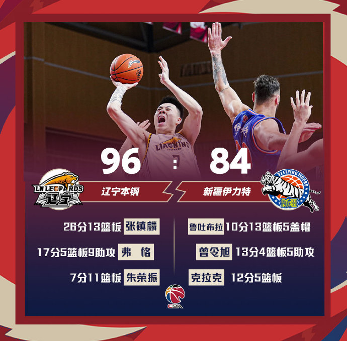 辽宁(43-9):张镇麟26分13篮板1助攻,弗格17分5篮板9助攻2抢断,梅奥13分2篮板3助攻3抢断,付豪10分6篮板,朱荣振7分11篮板,吴昌泽8分6篮板2助攻