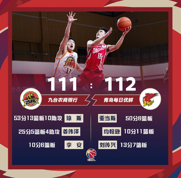 吉林(27-25):琼斯53分13板10助、姜伟泽25分5板4助、李安10分6板、代怀博7分3板