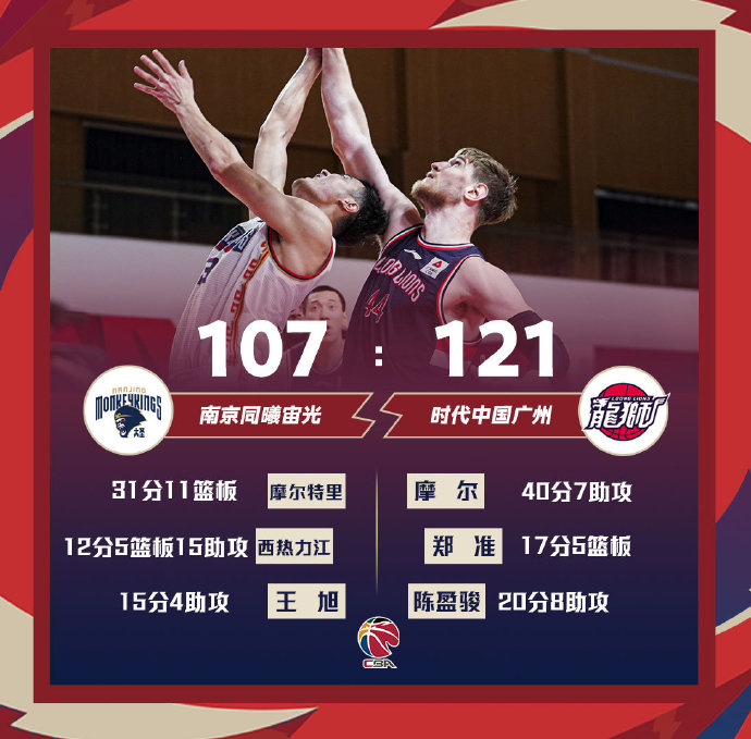 广州:摩尔40分4篮板7助攻2抢断、陈盈骏20分4篮板8助攻、祝铭震10分4篮板3助攻5抢断、郑准17分5篮板、哈斯10分4篮板、贾明儒9分