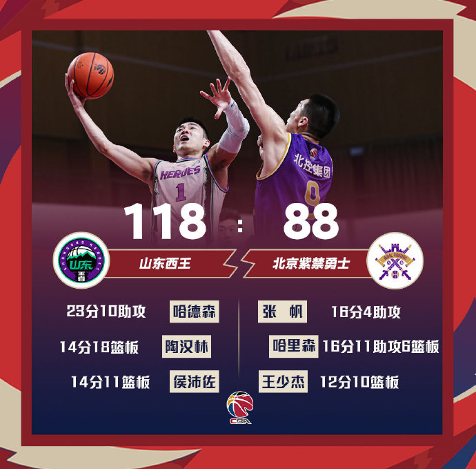 山东(30-21):哈德森23分4篮板10助攻,陈培东15分8助攻2抢断,陶汉林14分18篮板,贾诚17分7篮板2抢断,高诗岩8分6篮板11助攻4抢断,侯沛佐14分11篮板,吉伦沃特7分,焦海龙11分3篮板。