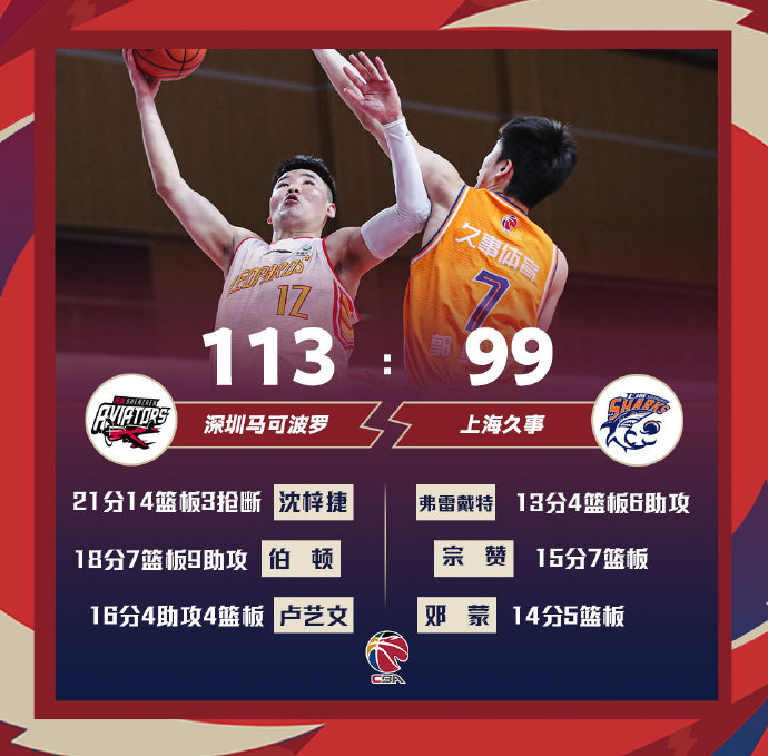 今日CBA常规赛,深圳迎战上海。深圳排名积分榜第8,上海最近遭遇两连败,22胜27负排名积分榜第13。比赛开始,上海首先发力取得6分领先,随后于梁里突外投连续拿分替深圳缩小分差,首节结束时,上海23-22仅领先深圳1分。次节上来,双方比分依旧胶着,上海抓住深圳失误一度领先5分,深圳快速调整后始终紧咬比分不放。易边再战,卢艺文外线爆发连中3记三分,上海进攻效率降低,深圳不断扩大领先优势,三节结束,深圳84-74领先上海10分。末节上来,上海打出一波8-3将分差缩小至只剩5分,但之后深圳里突外投接连得手,一度将分差扩大至16分,比赛随即失去悬念。最终,深圳113-99战胜上海。