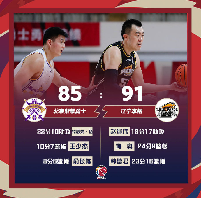辽宁(39-8):梅奥24分9篮板5助攻,张镇麟22分3篮板,韩德君23分16篮板,赵继伟13分17助攻,付豪6分10篮板,鄢手骐3分。