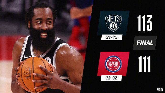 今日NBA常规赛,篮网客场挑战活塞。篮网目前30胜15负排名东部第3,活塞则12胜31负排名东部垫底。比赛开始,活塞率先发力取得5分领先,篮网逐渐找到进攻状态将比分反超,首节结束,篮网领先活塞7分。次节开始,斯图尔特肘击格里芬遭驱逐,哈登连续得分将分差逐步扩大,半场战罢,篮网59-50领先9分。易边再战,活塞外线手感恢复,抓住篮网失误一度将比分反超,但哈登最后时刻发力连得5分,篮网82-78领先4分结束第三节。末节初段,篮网下起三分雨,将比分优势迅速扩大至12分,活塞外线逐渐找到手感,一度将比分扳平,关键时刻,杰夫-格林命中关键三分,哈登6犯离场,随着活塞最后一攻不中,最终篮网113-111险胜活塞。