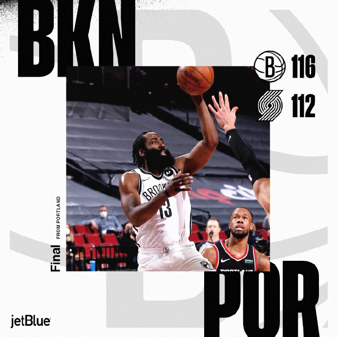 [微博全场集锦] 哈登25+6+17 欧文缺战 利拉德22+9 篮网险胜开拓者