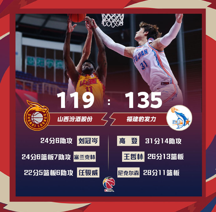 CBA常规赛继续进行,山西和福建迎来全明星赛的最后一战,比赛开始后高登手感火热单节独得11分,福建中段一波10-0奠定优势,首节结束后他们领先5分,次节回来,两队延续对攻节奏,尼克尔森里突外投单节砍下19分,福建末段再次打出10-0攻击波,半场战罢,福建继续领先7分。易边再战,山西进攻再次断电,高登联手王哲林扩大优势,三节结束时福建已经领先18分,末节上来,山西开局不断追分无奈后程乏力,最终福建135-119大胜山西。