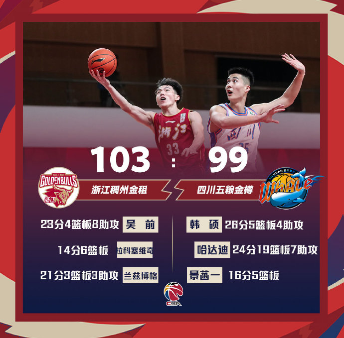 四川(24-21):韩硕26分5篮板4助攻、哈达迪24分19篮板7助攻2盖帽、景菡一16分5篮板2抢断、亨特16分、朱松玮8分、袁堂文5分5篮板2助攻、李原宇2分7篮板3助攻、苏若禹2分4篮板