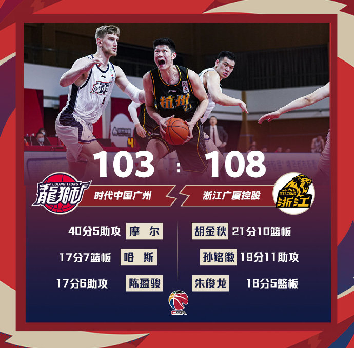 广厦(23-18):胡金秋21分10篮板1助攻,孙铭徽19分11助攻4篮板,赵俊龙17分4篮板、赵岩昊17分2篮板2助攻1抢断,许钟豪4分1篮板1助攻,李金效4分2助攻,费尔德8分7篮板2助攻2抢断。
