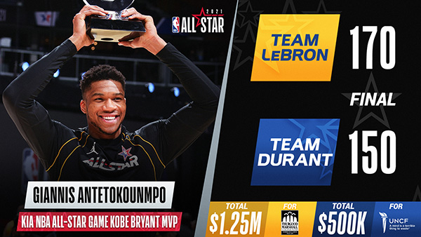 一年一度的全明星正赛今日在亚特兰大老鹰的主场如期举行,由于新冠疫情的特殊情况,现场缺少了球迷的欢呼和支持。与此同时,杜兰特队中杜兰特因伤缺阵,恩比德则接触新冠人员无缘比赛,塔图姆和锡安顶替两人首发出战。首节对决两队一如既往的以三分和扣篮拉开比赛序幕,詹姆斯队里字母哥和库里先后发力,前者砍下球队前23分里的13分,后者荣膺三分王后延续手感命中4记三分砍下12分,两人合力帮助詹姆斯队在首节取得1分领先。次节双方打得更加开放,前半节稍占优势的杜兰特队在后半节状态回落,而詹姆斯队则在库里和利拉德的三分带动中轰出一波27-8的攻势赢下第二节争夺,总比分上100-80领先杜兰特队。第三节的杜兰特队仍然是虎头蛇尾,詹姆斯队节末凭借布朗和乔治的5记三分扭转局势再次赢下单节对决。末节在加上24分争夺胜利中,大比分落后的杜兰特队让比赛失去悬念,利拉德最后时刻三记三分直接杀死比赛。最终,詹姆斯队击败杜兰特队夺得全明星赛的胜利,16投16中砍下35分的阿德托昆博当选MVP。