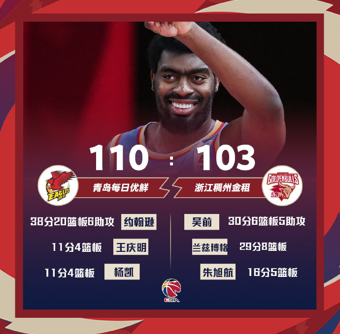 青岛(18-15):达卡里-约翰逊38分20板6助、杨凯11分4篮板、王庆明11分4篮板4助攻、许家晗10分、赵泰隆9分、林韦翰8分11助攻、