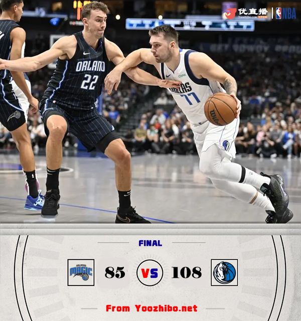 24直播网11月4日讯 NBA常规赛,独行侠主场迎战魔术,独行侠目前3胜2负,魔术2连败后3胜3负。比赛开始,魔术反客为主打得很主动,东契奇接连三分,马绍尔有攻有传,独行侠稳扎稳打反超比分,随后东契奇里突外投单节砍下14分助队领先到8分,次节独行侠一波10-2小高潮瞬间拉开比分,随后东契奇继续发力接连外线发炮单节又上双,独行侠再打出进攻波直接在半场领先到25分。下半场,双方命中率都有下降,但还是展开拉锯战,独行侠始终保持20分以上领先,末节魔术换替补练兵,克莱三分加喂饼助独行侠拉开30分以上领先,随后独行侠也进入轮换,最终独行侠108-85大胜魔术,送对手3连败。
