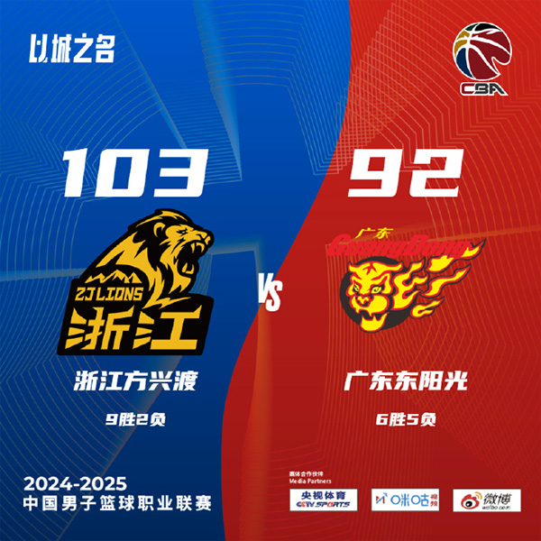 2024年11月29日讯 CBA常规赛,广东客场挑战广厦。广东目前6胜4负,广厦8胜2负。比赛开始,胡明轩连中三分带队取得领先,广厦内外开花打出10-0的攻击波强势反超,次节广厦持续发力,多点开花将分差拉开到两位数,半场战罢广厦62-50领先广东。易边再战,广厦命中率下降,广东连投带罚缩小分差,末节广东持续发力完成11-2的攻击波反超比分,孙铭徽挺身而出内外开花带队打出9-0重获两位数优势,广东大势已去无力回天。最终,广厦103-92力克广东。