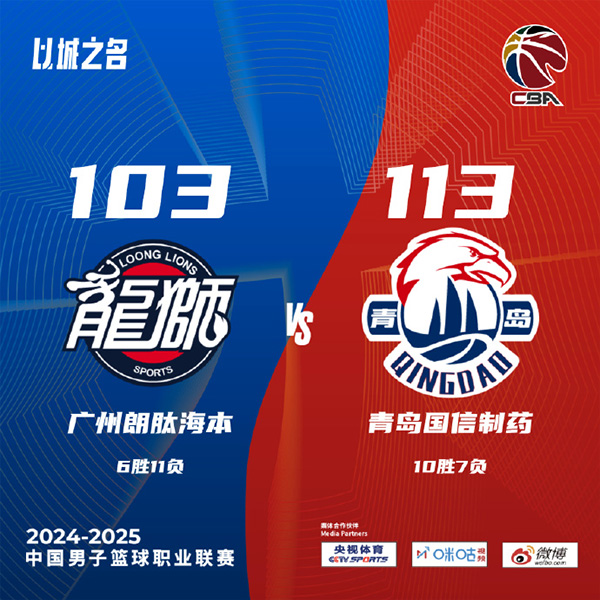 2024年12月14日讯 CBA常规赛,广州主场迎战青岛,广州目前6胜10负排在第15位,青岛则是9胜7负排名第10,本场比赛郭艾伦继续缺阵,丁彦雨航还未体测。比赛开始,杨瀚森攻防两端发力,赵嘉义也接连三分命中,青岛顺势取得领先,但广州双外援联手回应咬住比分,韦瑟斯庞里突外投连砍9分,首节青岛领先5分,次节米奇和韦瑟斯庞协同发力拉开双位数领先,随后青岛下起三分雨一度领先到近20分,但广州半场结束前接连3记三分回应追到差9分。下半场,双方展开拉锯战,广州依靠外援追分,韦瑟斯庞连续3记不讲理超远三分强势回应,三节青岛继续领先10分,末节双方还是外援互相对飚,分差始终保持在10分左右,韦瑟斯庞总能在关键时刻站出来回应,最终青岛113-103力克广州。