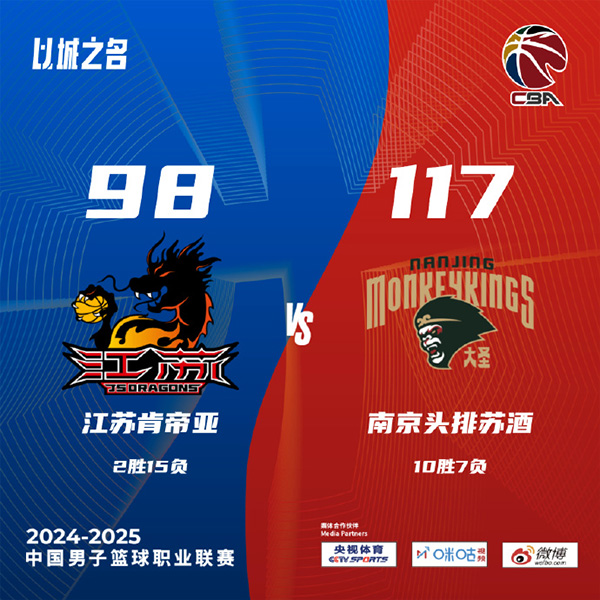 2024年12月14日讯 CBA常规赛,江苏和同曦迎来德比。江苏目前2胜14负,同曦9胜7负。一开场,双方势均力敌,比分始终紧咬,江苏不断冲击内线频频得手,同曦内外开花迅速回应,次节同曦占得先机,此后却突然哑火,江苏轰出17-0强势反超,郭昊文高效发挥带队追赶,半场战罢双方战成60平。下半场,郭昊文延续火力,得分助攻一肩挑带队将分差拉开到两位数,末节林葳连中三分将分差拉开到20分,江苏大势已去无力回天。最终,同曦117-98击败江苏,赢下德比。
