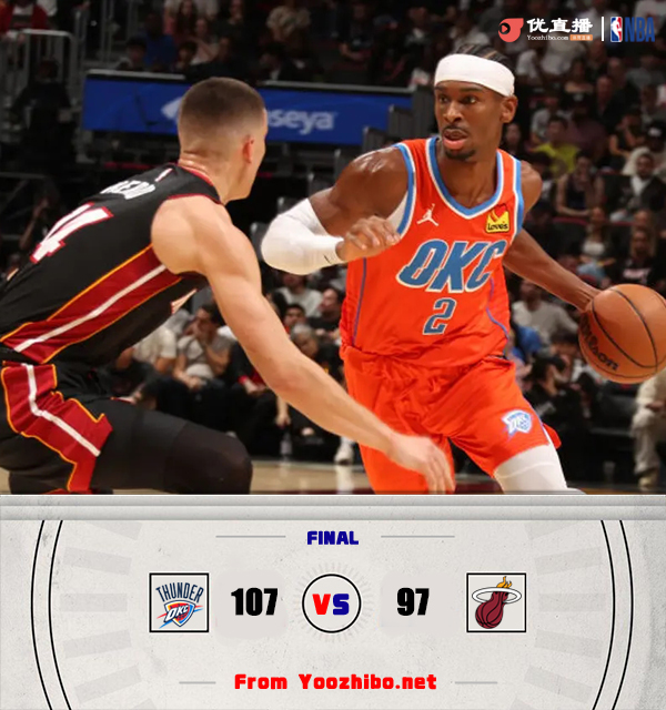 北京时间12月21日讯 NBA常规赛,雷霆客场挑战热火。雷霆常规赛6连胜,以21胜5负高居西部第一,热火13胜11负排东部第六。上半场,双方开场势均力敌,比分交替领先,巴特勒身体不适退出比赛,亚历山大得分助攻一肩挑,热火不断冲击内线顽强咬住,半场战罢雷霆50-47领先热火3分。下半场,亚历山大持续发力,单节拿到13分帮助球队取得两位数优势,末节双方围绕10分左右分差展开激烈争夺,雷霆稳扎稳打保持优势,热火苦苦追赶无果。最终,雷霆104-97击败热火,取得常规赛7连胜。