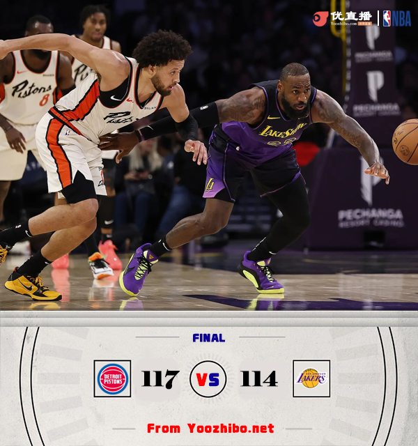 北京时间12月24日讯NBA常规赛继续开打,湖人坐镇主场迎战活塞,湖人近期状态回暖,过去两场双杀国王后取得3连胜;活塞方面上一场击败太阳后,近期3胜2负状态同样有所回暖。首节之争双方状态都非常出色一路对攻,湖人开局稍占上风但末段让出主动权,活塞最后4分钟里命中4记三分送出16-6的攻势一举反超比分;次节剧本反转,这一次轮到活塞占据主动领先大半节时间,但最后时刻湖人连续回敬三分并夺回2分领先进入下半场。休息归来场面依旧持续拉锯,两支球队没有绝对爆点高分但命中率奇高,三节结束时双方都保持着超50%的命中率,不过末节决胜还是活塞笑到最后,湖人节中熄火直接导致败局,活塞则依靠一波7-0拉开两位数领先,詹姆斯末段连拿5分帮助球队在读秒阶段追至3分,不过最后错失扳平三分未能扳平比分。最终,活塞客场掀翻湖人拿下比赛。