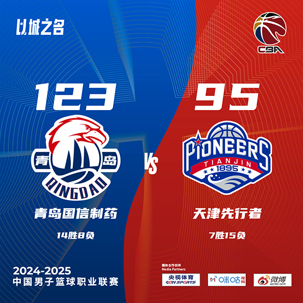 北京时间12月25日讯 CBA常规赛,青岛主场迎战天津。青岛13胜8负排联赛第八,天津7胜14负列联赛第十四。一开场,青岛率先发力,多点开花轰出17-3的开局,大卫-詹姆斯包揽球队开场15分苦苦追赶,次节青岛牢牢占据场上主动,韦瑟斯庞高效输出带队扩大优势,半场战罢青岛65-45领先天津20分。下半场,天津里突外投拿分缩小分差,青岛多点开花稳住局势,末节青岛稳扎稳打保持优势,天津大势已去无力回天。最终,青岛123-95轻取天津,主场过关。