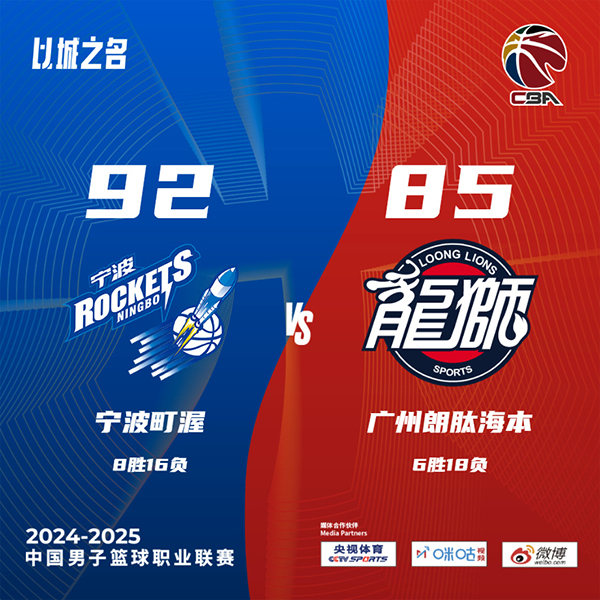 24直播网讯北京时间12月30日讯 CBA常规赛,宁波今日迎战广州,前者上场比赛不敌青岛,后者更是状态糟糕已经七连败。比赛上来,广州率先拿到两分后宁波连拿六分取得领先,分差也是拉开到两位数,整个第一节广州的进攻都不好只拿到16分,次节广州的表现依旧没有好转,场上分差不减反增,半场结束时宁波领先14分;下半场回来,两队的命中率仍然很低,不过宁波始终占据着场上的主动权,广州无法获得迫近比分的机会,末节广州一度将分差追到个位数但终究无法实现逆转,最终宁波轻取广州,送给后者八连败。