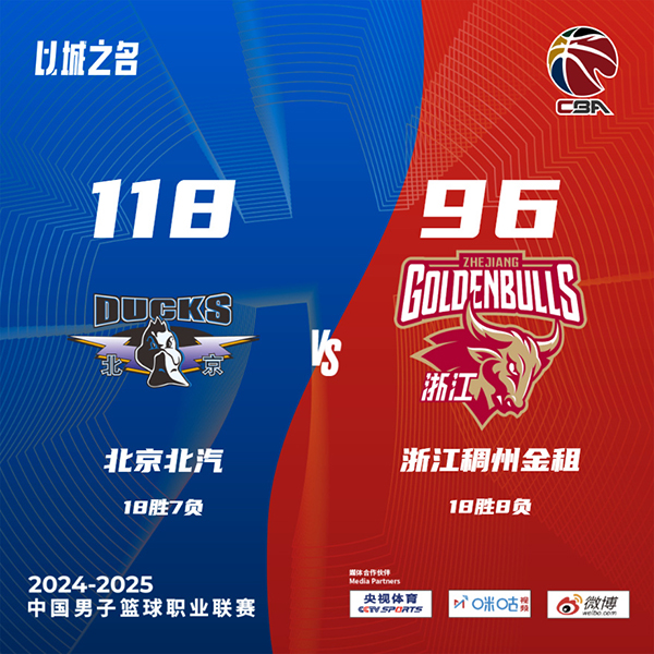 北京时间1月3日CBA常规赛,北京北汽对阵浙江稠州金租。本场比赛,稠州余家豪、吴前、程帅澎等球员均因伤缺阵。半场北京65-50浙江,最终北京118-96浙江。北京北汽尤金-杰曼24分6板13助,周琦18分4板,曾凡博16分6板;浙江稠州金租陆文博21分5板,约克22分3助。
