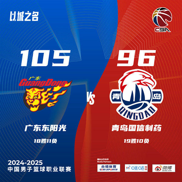 北京时间1月10日讯 CBA常规赛,广东主场迎战青岛,两队最近状态都不错,都经历4连胜,广东17胜11负排在第9位,青岛则是19胜9负排在第7位。比赛开始,吉伦沃特和徐杰接连三分为广东开局,而青岛则是靠外援韦瑟斯庞和米奇撑起进攻端,他俩带队一波9-0首节领先4分,次节广东接连失误,韦瑟斯庞状态出色里突外投连砍8分带队领先到双位数,随后吉伦沃特里突外投苦苦支撑,杨瀚森接连内线强打,青岛半场依旧领先9分。下半场,双方展开拉锯战,吉伦沃特继续撑起球队进攻,青岛外援联手回应,徐昕攻防两端建功助广东三节反超2分,末节徐昕接连送大帽,广东打出10-0拉开比分,打了4分多钟段昂君接连三分终于止血,但广东始终保持住10分左右领先,最终广东105-96逆转青岛,拿到5连胜。
