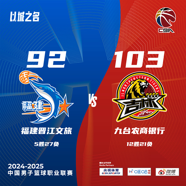 北京时间1月20日讯 CBA常规赛继续进行,福建主场迎战吉林,吉林近期遭遇连败,目前11胜21负暂列联赛第15位,福建上场不敌广东,5胜26负联赛垫底。此役一上来双方便陷入缠斗,约瑟夫-杨和邹阳联手取分,琼斯盘活全队强势回应,两队你来我往比分紧咬,首节结束时福建领先2分,次节回来,双方继续鏖战,路易斯-金突然发力单节贡献12分,琼斯和基兹林克接连回应,半场战罢,福建依然领先2分。短暂休整后福建一波8-0一度拉开比分,吉林及时回暖连中三分,三节结束后吉林反超1分,末节决战,福建进攻滞涩,琼斯予取予求率队奠定胜势,福建追分无望,最终吉林103-92力克对手。