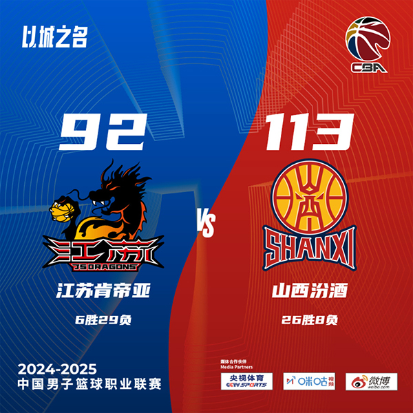 北京时间1月25日讯 CBA常规赛,江苏对阵山西,江苏上场比赛击败天津结束6连败,山西上场比赛被同曦终结连胜势头。开场后刘传兴多次打内线得手,江苏靠着两名外援的发挥后来居上,两队经过一段混战后,山西队的古德温连续冲击内线追平比分。两队首节都犯规颇多,第二节上来山西依旧多次强攻篮下拿分,贾明儒外线手感火热接连三分命中将领先优势扩大,江苏队靠着外援的发挥努力追分,但全面开花的山西在半场结束时依旧手握15分优势。易边再战,汤普森面对刘传兴多次在中距离投篮命中,不过山西进攻发挥稳定始终保持两位数优势,张宁内突外投接连拿分。最后一节张宁延续状态频频杀入内线帮助山西将分差拉大到20分以上,比赛失去悬念,最终山西113-92轻松击败江苏。