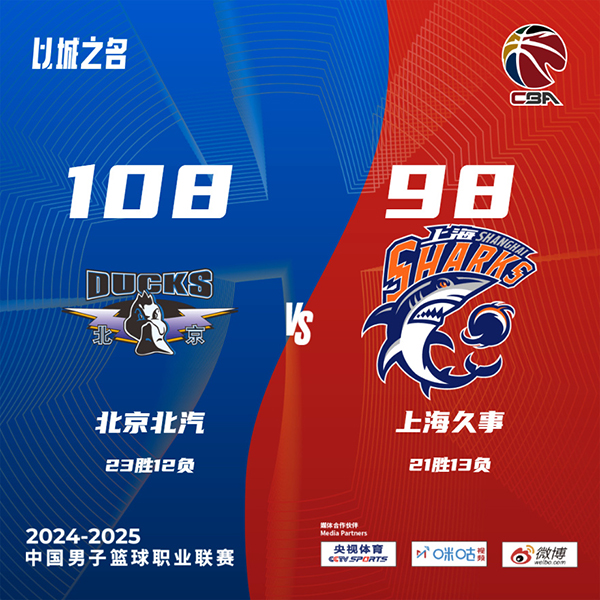北京时间2月27日,CBA常规赛北京北汽主场迎战上海久事,本场上海背靠背作战,王哲林缺阵。首节双方紧咬比分,第二节后半段北京一波高潮拉开分差,半场北京61-52上海,第三节北京一度领先14分,随后上海李弘权、布雷德索联手追至2分分差,末节后半段北京再度打出反击高潮收下比赛,最终北京108-98上海。