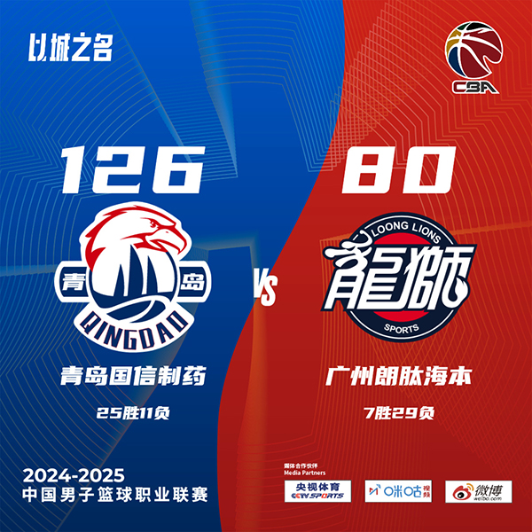 北京时间3月5日讯 CBA常规赛,青岛今日迎战广州,前者近来取得两连胜,后者则是遭遇七连败。比赛上来,两队就打得很胶着,场上比分交替领先,不过本节的最后三分钟时间里广州一分未得,青岛趁势打出一波10-0的小高潮,次节韦瑟斯庞的反击上篮将分差拉开到两位数,好在是广州在节末连拿六分完成止血,半场结束时广州还落后4分;易边再战,场上局势完全一边倒,广州在近半节的时间里只拿到4分,三节结束时青岛已经建立起30分的领先优势,比赛在末节早已失去悬念,最终青岛大胜广州,送给后者八连败。