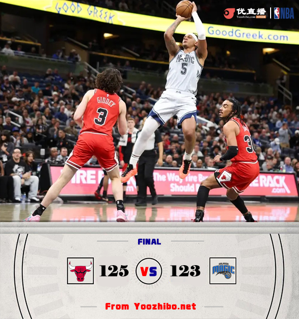 北京时间3月7日讯 NBA常规赛,魔术主场迎战公牛。魔术4连败,以29胜34负排东部第8,公牛24胜38负东部第10。上半场,两队开场便陷入缠斗,比分始终紧咬,魔术轮番冲击内线屡屡暴扣,公牛多点开花给出回应,次节双方继续对攻,公牛全民皆兵,班凯罗连造杀伤还以颜色,半场战罢公牛69-66领先魔术3分。下半场,魔术轰出17-4一度取得两位数领先,公牛多点开花扳平比分,末节双方争夺陷入白热化,关键时刻怀特内外开花连得5分,班凯罗绝杀三分不中,公牛125-123魔术险胜过关。