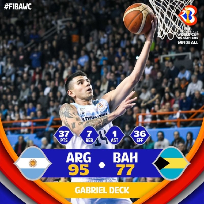 24直播网讯 8月30日讯 在今天结束的一场世预赛第四窗口期的比赛中,阿根廷95-77击败巴哈马。本场比赛,曾效力于雷霆的加布里埃尔-戴克表现抢眼,19投14中,砍下37分7篮板1助攻。