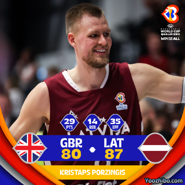 24直播网讯 北京时间8月29日,2023男篮世界杯预选赛,凭借克里斯塔斯-波尔津吉斯的29分14篮板,拉脱维亚以87-80力克英国。全场比赛,波尔津吉斯12投9中,三分3中1,罚球12中10,得到29分14篮板。