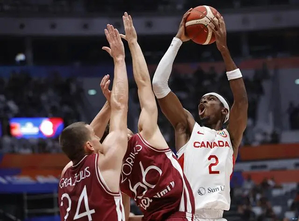 男篮世界杯如火如荼继续开打,H组的第一加拿大和第二拉脱维亚展开一场较量。两支球队小组赛前两场比赛全部取胜且都已经确定出线,本场比赛的胜者将夺得小组第一的席位。首节比赛加拿大的“全明星阵容”状态奇差,亚历山大、狄龙和巴雷特三人总计11投3中,球队这一节仅命中4记运动战进球;拉脱维亚则在外线大做文章并命中5记三分迅速确立起两位数领先。次节加拿大终于找回自己擅长的转换快速得分机会,节中他们轰出15-5的攻势迅速追上比分,巴雷特最后抓对手失误打进压哨上篮帮助加拿大反超1分进入下半场。休息归来亚历山大和巴雷特连续飙进三分并带队取得9分领先;随后的得分荒给了拉脱维亚追近分差的机会,但亚历山大这一节状态实在火热,这一节独砍16分的他在末段帮助球队重新拉开至10分优势;末节加拿大延续状态再送14-4的攻势,分差也直接拉大至20分杀死悬念。最终,加拿大击败拉脱维亚,并以三连胜的姿态完美出线;拉脱维亚虽然输球但不妨碍他们小组第二出线。