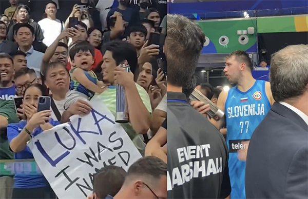 赛后,东契奇不仅把他的比赛球鞋送给现场的球迷,而且把自己获得的本场最佳球员奖杯送给现场的球迷,这对菲律宾夫妇举着标牌,上面写着:卢卡,我是以你的名字(给我的孩子)命名的;一旁的其他球迷都是一脸羡慕的表情。