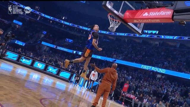 第一位出场的是科尔-安东尼,他的前戏比较多,换上了一双军鞋,他的第一个动作是助跑起跳大风车扣篮,连续尝试两次都未成功,第三次扣篮成功,一共得到40分。这一扣难度较低,并未有太多出彩地方。