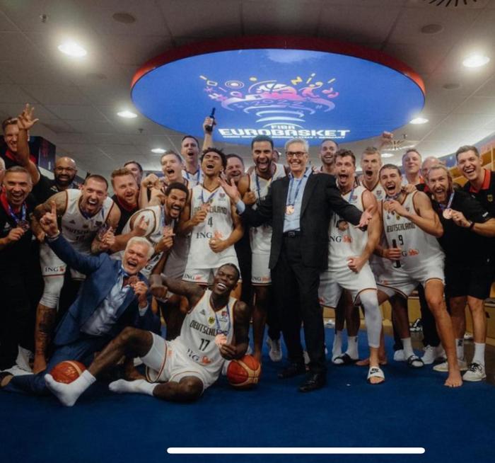 施罗德晒更衣室合影庆祝夺牌 咧嘴大笑咬铜牌:德国,这是给你们的