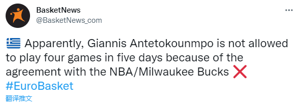 24直播网09月06日讯 欧洲杯小组赛希腊93-77大胜英国,雄鹿巨星字母哥轮休缺席比赛,因膝盖不适而休战吗?据美媒BasketNews报道,字母哥昨晚轮休的原因是希腊与雄鹿达成了协议,不允许他在五天内打四场及更多比赛;富尼耶呼吁给球员更多的休息时间,东契奇直言可能导致更多的伤病。