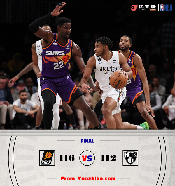 NBA常规赛继续进行,篮网主场迎战太阳,篮网刚刚交易走欧文,迎来丁威迪和芬尼-史密斯,但本场教练决定两人不上场,渡边雄太和小库里也不打,但西蒙斯缺席5场后复出;而因腹股沟伤势缺席21场的布克本场也终于迎来复出。上半场属于布克和托马斯的对攻战,布克复出状态十分不错,里突外投连续得分,而艾顿次节也是连续吃饼单节得分上双,而篮网进攻端主要靠托马斯撑起,他继续延续火热状态半场再砍下24分,双方比分始终拉不开,太阳得分点更多取得微弱领先。下半场,布里奇斯找到手感里突外投连砍8分帮助太阳拉开双位数分差,但托马斯马上带领篮网回应一波12-0攻击波,随后双方展开拉锯战,太阳依靠替补不错发挥再次拉开双位数领先,但篮网连续外线发炮再次10-0咬住比分,关键时刻布克两罚全不中,但“点球”大战篮网没有暂停非常致命,艾顿两罚全中杀死比赛,最终太阳险胜篮网,取得3连胜。