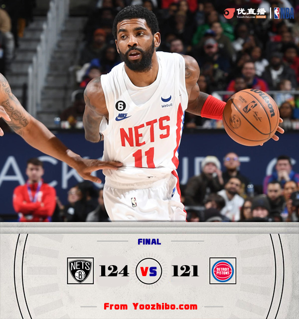 NBA常规赛,篮网客场挑战活塞。篮网5连胜升至东部第四,活塞东部倒数第二。比赛开始,活塞利用主场优势率先发力,内外开花很快取得两位数领先。篮网逐渐进入状态不断冲击内线拿分咬住分差。双方大打对攻,活塞多点开花保持优势,半场战罢活塞71-54领先。易边再战,活塞命中率下降,杜兰特开启死神模式单节狂轰26分帮助篮网单节净胜19分一举扭转颓势。末节两队展开激烈争夺, 篮网连中三分占据主动,末段2分多钟的时间双方颗粒无收,博扬飙中三分后欧文3罚2中,篮网顶住了对手的反扑惊险过关。